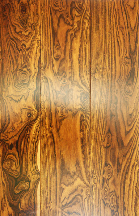 Has a yellowish brown body with dramatic dark brown to almost black stripes. Color tends to darken with age. Also, the grain patterning can be quite striking. Heartwood is rated from moderately durable to very durable depending on the species. With its striking, zebra-like contrasts, and bold figuring, Bocote can be a very eye-catching wood. Bookmatching two consecutive panels can create symmetrical ”faces” and other patterns in the wood.